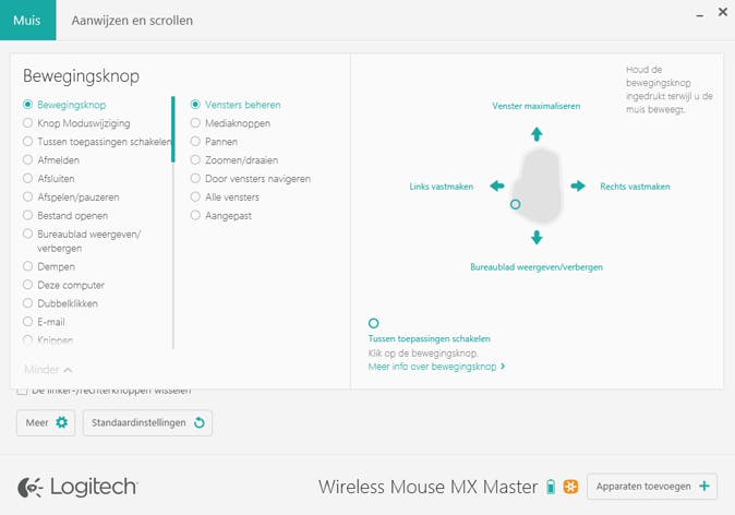 De muis heeft naast de normale knoppen en scrollwieltje nog vier extra knoppen. De eerste vind je onder het gedeelte waar je duim op rust. Die duim gebruik je ook om de twee bladerknoppen en een tweede scrollwieltje te bedienen. Jammer is dat de bladerknoppen wat klein zijn en ver naar achteren zitten doordat ze achter het scrollwieltje zitten. Bovenop vind je nog een programmeerbare knop. Je kunt verder de functionaliteit van de twee bladerknoppen, de duimschakelaar en de middelste muisknop instellen. Het normale scrollwieltje kun je schakelen tussen stapsgewijs scrollen en vrij scrollen zonder weerstand. De software waarmee je de functies programmeert, zit duidelijk in elkaar.