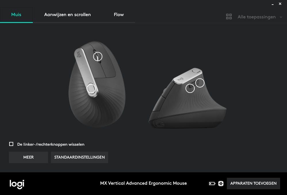 Rechts op de MX Vertical zitten de twee muisknoppen en een scollwiel. Dit is helaas niet het scrollwiel dat we kennen van andere MX-producten en waarbij je kunt wisselen tussen kliksgewijs en supersnel scrollen of je door even op het muiswiel te klikken van links naar rechts scrolt. Dit is een standaard scrollwiel zonder enige extra’s. De duim ligt comfortabel aan de linkerzijde op de muis en daar bevinden zich nog twee knoppen, die je standaard gebruik voor vooruit en terug bladeren. Naar ons gevoel hadden deze wel iets groter gemogen en vergt zeker de knop het dichtst bij de pols, best een grote beweging van de duim. Eén knop boven en één onder de duim was misschien beter geweest. Via de uitstekende Logitech Options-software kun je de functie van alle knoppen op de muis aanpassen