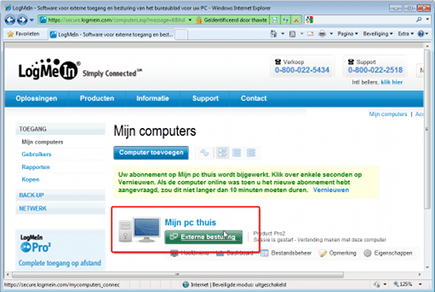 Voordat u het scherm van uw thuiscomputer kunt overnemen, dient u het LogMeIn-programma daarop te installeren. Meld u met uw mailadres en wachtwoord aan bij LogMeIn. Klik op Mijn computers en kies Voeg deze computer toe. Gebruik de knop Nu downloaden en installeer het LogMeIn-programma op uw computer. De installatie is eenvoudig te doorlopen, door steeds op Volgende te klikken. Geef, zodra hierom wordt gevraagd, een omschrijving op voor uw computer. Met deze omschrijving verschijnt uw thuiscomputer in het overzichtsscherm van uw LogMeIn-pagina. Wij kiezen in dit voorbeeld voor de toepasselijke omschrijving Mijn pc thuis. Geef ook uw mailadres en wachtwoord op tijdens de installatie. Deze informatie wordt onthouden door het LogMeIn-programma op uw thuiscomputer. Let op: om foutmeldingen te voorkomen is het raadzaam om tijdens de installatie al aan te geven dat u LogMeIn Free wilt gebruiken. Standaard is LogMeIn Pro² geactiveerd. Verander deze instelling naar LogMeIn Free. Er wordt mogelijk ook om een extra beveiligingscode gevraagd tijdens de installatie, dit is een extra wachtwoord naar keuze. Herstart uw computer na de installatie. LogMeIn is direct klaar voor gebruik. U kunt uw beeldscherm, toetsenbord en muis overnemen vanaf een andere computer.