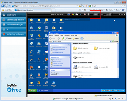 Het beeldscherm van uw thuiscomputer wordt niet direct getoond. Hiervoor is één extra muisklik nodig, op Besturing op afstand. Het bureaublad van uw thuiscomputer verschijnt nu. U kunt direct de muis gebruiken en het toetsenbord bedienen. De achtergrond van het bureaublad wordt tijdelijk uitgeschakeld, om betere prestaties te krijgen. Met een standaard breedband-internetverbinding werkt LogMeIn doorgaans overigens prima. U kunt de prestaties eventueel nog beïnvloeden via Opties, Kleurenkwaliteit. Het beeldscherm van uw thuiscomputer draait in een venster van uw webbrowser. Dit is voldoende voor het uitvoeren van eenvoudige taken, maar u kunt het beeldscherm ook aanpassen aan de omvang van het scherm waarachter u werkt. Kies Opties en vervolgens Volledig scherm. LogMeIn toont boven in beeld een werkbalk waarmee u nog meer opties instelt en waarmee u terug kunt keren naar de kleinere weergave.