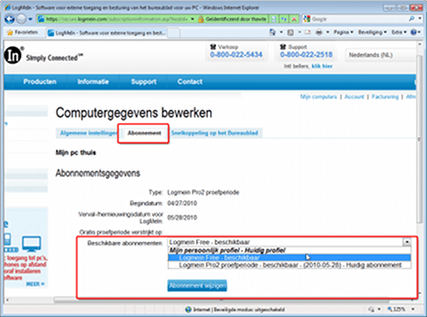 Bij sommige registraties van LogMeIn wordt een probeerversie van LogMeIn Pro² actief, in plaats van het gratis LogMeIn Free. Met die probeerversie beschikt u over alle functies die LogMeIn te bieden heeft, maar na de probeerperiode wordt uw account beperkt. Het is natuurlijk leuk om de mogelijkheden te verkennen, maar het is niet prettig om achteraf tegen beperkingen op te lopen. Voor thuisgebruik zijn de mogelijkheden om het scherm, het toetsenbord en de muis van één computer over te nemen voldoende. Deze functie is aanwezig in het gratis LogMeIn Free, dat we als uitgangspunt hebben genomen voor dit artikel. U kunt de probeerversie van LogMeIn Pro² handmatig omzetten naar LogMeIn Free. Meld u aan via LogMeIn. Onder Mijn computers ziet u uw thuiscomputer staan. Achter Product staat uw abonnementsvorm. Als hier iets anders staat dan Free, hebt u een probeerversie van de commerciële variant van LogMeIn. Klik in dat geval op Eigenschappen, Abonnementen en selecteer in het drop-downmenu LogMeIn Free. Bevestig de aanpassing met de knop Abonnement wijzigen.