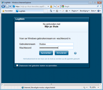 Start een willekeurige computer met een internetverbinding en open een webbrowser. De beste browsers om het beeldscherm van uw thuiscomputer over te nemen zijn Internet Explorer en Firefox. Surf naar LogMeIn en meld u aan met uw mailadres en wachtwoord. Het hoofdscherm toont uw thuiscomputer. Als de computer gereed is om over te nemen, is de knop Externe besturing zichtbaar aanwezig. Als het systeem niet gereed is, staat hier de melding Offline. Klik op Externe besturing om uw thuiscomputer over te nemen. Voor de overname is een browseruitbreiding nodig. Voor Internet Explorer heet dit een ActiveX-besturingselement, voor Firefox een Invoegtoepassing. Als de browseruitbreiding niet aanwezig is op de computer, wordt hij na een bevestiging automatisch geïnstalleerd. Na de installatie dient u de webbrowser opnieuw te starten en uzelf opnieuw aan te melden via LogMeIn. Zodra u nu opnieuw op Externe besturing klikt verschijnt er een aanmeldscherm. Dit is de tweede stap van de beveiliging. Geef hier de Windows-gebruikersnaam en het bijbehorende wachtwoord op (zie paragraaf 3).