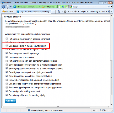 Een programma installeren op een computer waarmee verbinding op afstand mogelijk is, geeft niet iedereen een veilig gevoel. Bij dit gevoel hoort wel de kanttekening dat elke computer die is aangesloten op internet en aan staat, een potentieel beveiligingsrisico vormt. Ook als u alleen maar op internet surft ligt er gevaar op de loer. LogMeIn biedt echter uitgebreide controlemogelijkheden. Zo kunt u onder andere een e-mailmelding krijgen zodra iemand probeert om met uw gegevens in te loggen op LogMeIn, maar daarbij het verkeerde wachtwoord gebruikt. Om deze melding te activeren, meldt u zich aan bij LogMeIn en kiest u Account, Extra beveiliging. Onder Account controle vindt u de meldingen die u kunt krijgen. Een belangrijke optie is Een aanmelding in mijn account mislukt. Deze is standaard actief. Naast meldingen kunt u extra verificatie met codes instellen. Dit is op zich niet nodig en voor thuisgebruik is het misschien wel teveel van het goede, omdat de beveiliging van LogMeIn standaard al goed in elkaar zit. Wie daar geen genoegen mee neemt kan de beveiliging echter naar wens aanscherpen.