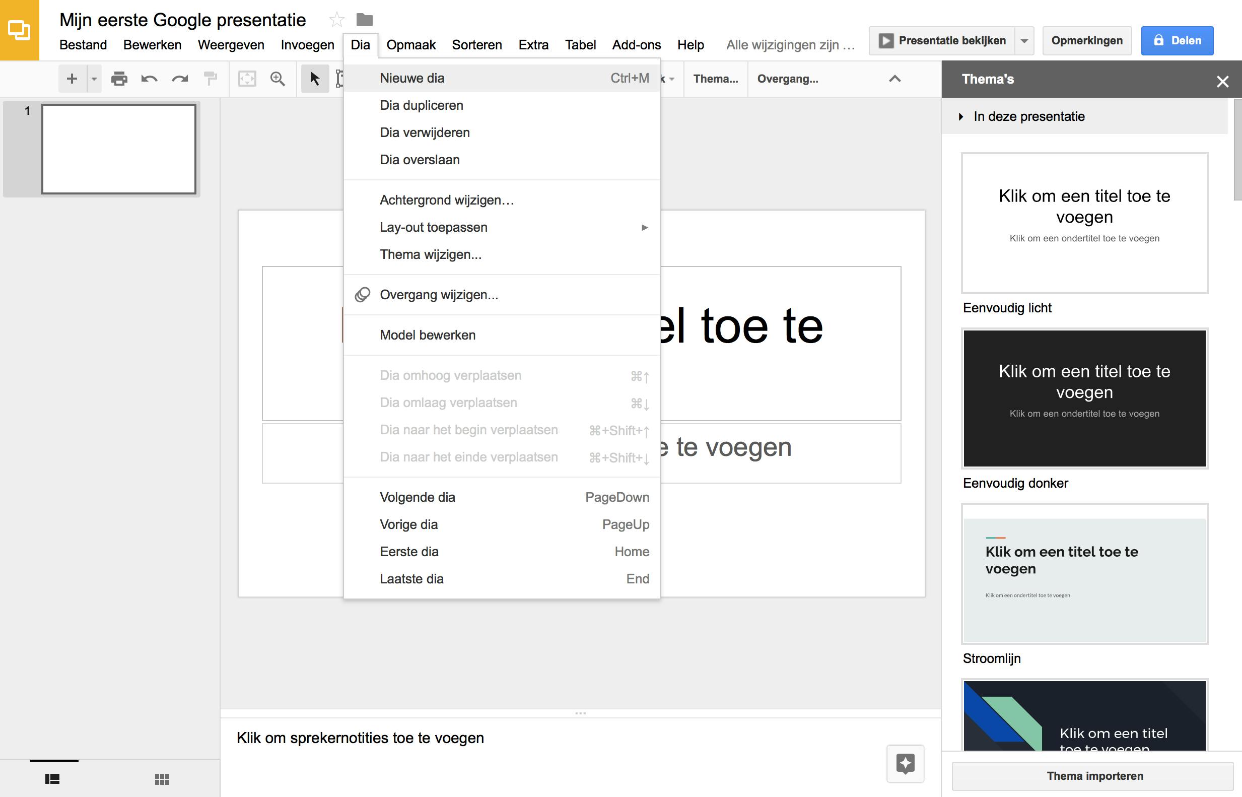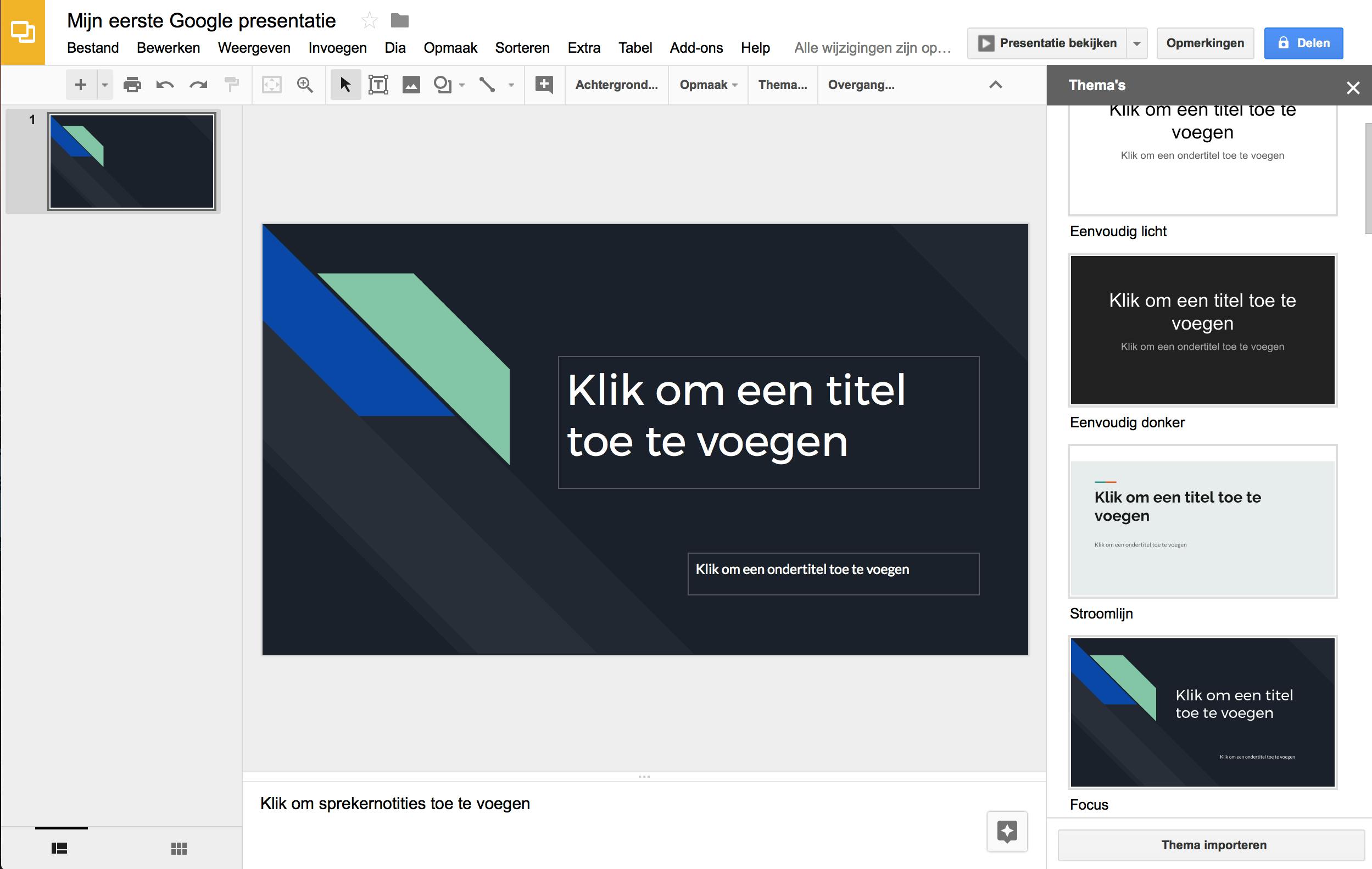 Wil je je presentaties een beetje mooier maken, dan kun je thema’s gebruiken. Hiervoor klik je rechts op een van de thema’s. Zie je de beschikbare thema’s niet, klik dan bovenin op de knop Thema. De thema’s zijn niet zo uitgebreid als de sjablonen in Prezi, maar zijn allemaal prima bruikbaar voor een professionele presentatie. Klik op Klik om een titel toe te voegen of kies voor Klik om een ondertitel toe te voegen om je slide met informatie te vullen. Onderaan kun je notities per slide invullen; dit kan je helpen tijdens je presentatie. Een overgang tussen twee dia’s maak je door bovenin op Overgang te klikken en als je een achtergrondafbeelding wilt instellen, dan kies je voor Achtergrond. Als je klaar bent, kies je voor Presentatie bekijken. Al je wijzigingen worden overigens automatisch opgeslagen.