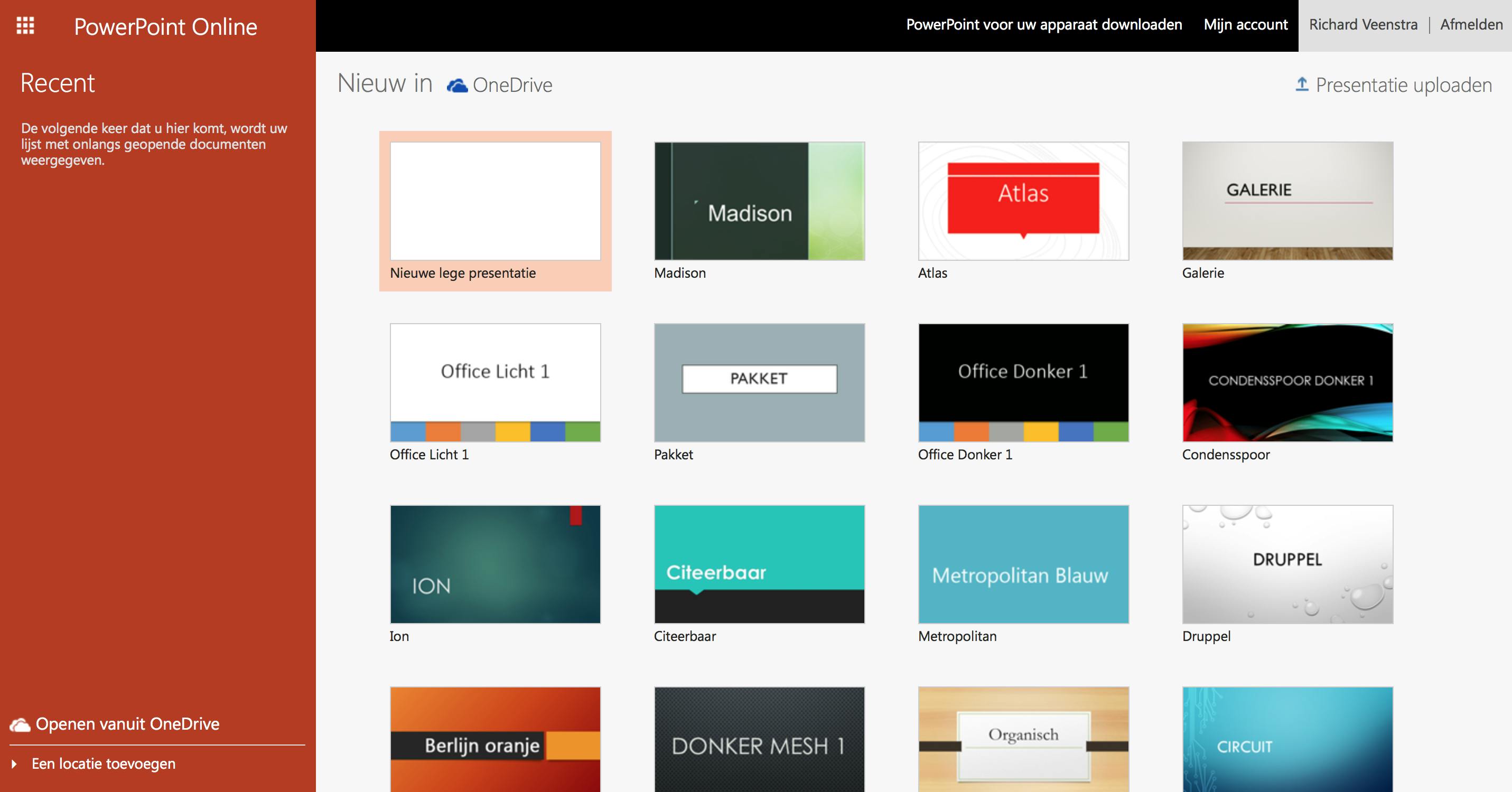 Als je gewoon een basisversie van PowerPoint wilt, maar de presentatie-opties van Sway te simpel vindt, dan kun je ook gewoon de gratis online versie van PowerPoint gebruiken. Je logt met je Microsoft-account in, kiest een van de sjablonen of maakt een nieuwe presentatie door op Nieuwe lege presentatie te klikken. Je kunt ook een bestaande PowerPoint-presentatie uploaden door bovenin op Presentatie uploaden te klikken. Zo werk je online aan je presentatie verder. Je mist uiteraard wel enige functies die je alleen in de desktopversie vindt, maar PowerPoint Online voelt desondanks als een vrij volledig programma. Je bestand wordt automatisch tussendoor opgeslagen in je OneDrive-account en als je het bestand weer wilt openen in de desktopversie van PowerPoint, dan klik je gewoon op Open in PowerPoint.