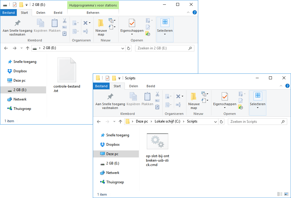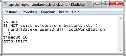 Het script werkt eenvoudig. Het begin van de lus wordt aangeduid met :start. Met de regel If NOT exist e:\controle-bestand.txt wordt gekeken of het controlebestand onbereikbaar is. Dit is het geval als de stick niet meer aanwezig is in je computer. Met de opdracht rundll32.exe user32.dll, LockWorkStation wordt je systeem vergrendeld. Timeout 10 is een vertraging. Als je bijvoorbeeld een fout maakt in het script, heb je tien seconden om het script af te breken met de toetscombinatie Ctrl+C. Met de laatste regels goto start stuur je het script terug naar het begin en wordt de controle opnieuw uitgevoerd.