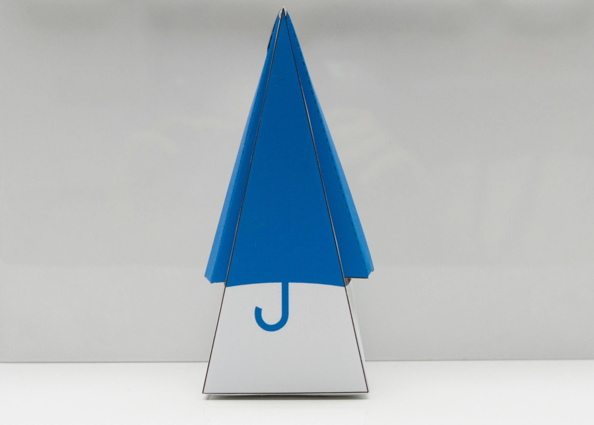 Download het pdf-bestand met daarin de bouwtekening voor de paraplu en open het bestand in Acrobat Reader om het af te drukken. Controleer voordat je op Afdrukken klikt goed de instellingen, want het document is in het Amerikaanse Letter-formaat. Zorg er dus voor dat je het document bij het afdrukken niet verkleind om het helemaal passend op een A4 te krijgen door te kiezen voor Ware grootte. Ter controle heeft Google op de eerste pagina een lijn gezet die precies één inch breed is wanneer je het document op de juiste grootte hebt afgedrukt. Nu kun je alle onderdelen uitknippen langs de dikke lijnen. De onderdelen zoals B, C en G bevatten ook dingen middenin die je moet uitsnijden. De stippellijnen moet je vouwen, het is handig als je met behulp van een liniaal en een lege pen de stippellijnen eerst inkrast om ze eenvoudiger te vouwen. Als alternatief is een (bank)pasje dat je op de stippellijnen legt een handig hulpmiddel om scherpe vouwen te maken. Je legt het pasje op de vouwlijn waarna je de vouw maakt. Hier vind je stap voor stap de vouw- en plakinstructies. Je begint in deel 1 met de onderdelen D, E en F waarna je in stap 2 het omhulsel B voor de motor bouwt. Let er hierbij op dat je het wijzertje op de servomotor eerst helemaal tegen de klok indraait waarna je het wijzertje verwijdert. In deel 3 vouw je onderdeel G, het omhulsel voor de wijzer. We willen je nog wel één tip meegeven tijdens het vouwen en lijmen van deel 3. Zorg ervoor dat je in de laatste stap de vleugels niet vastlijmt.
