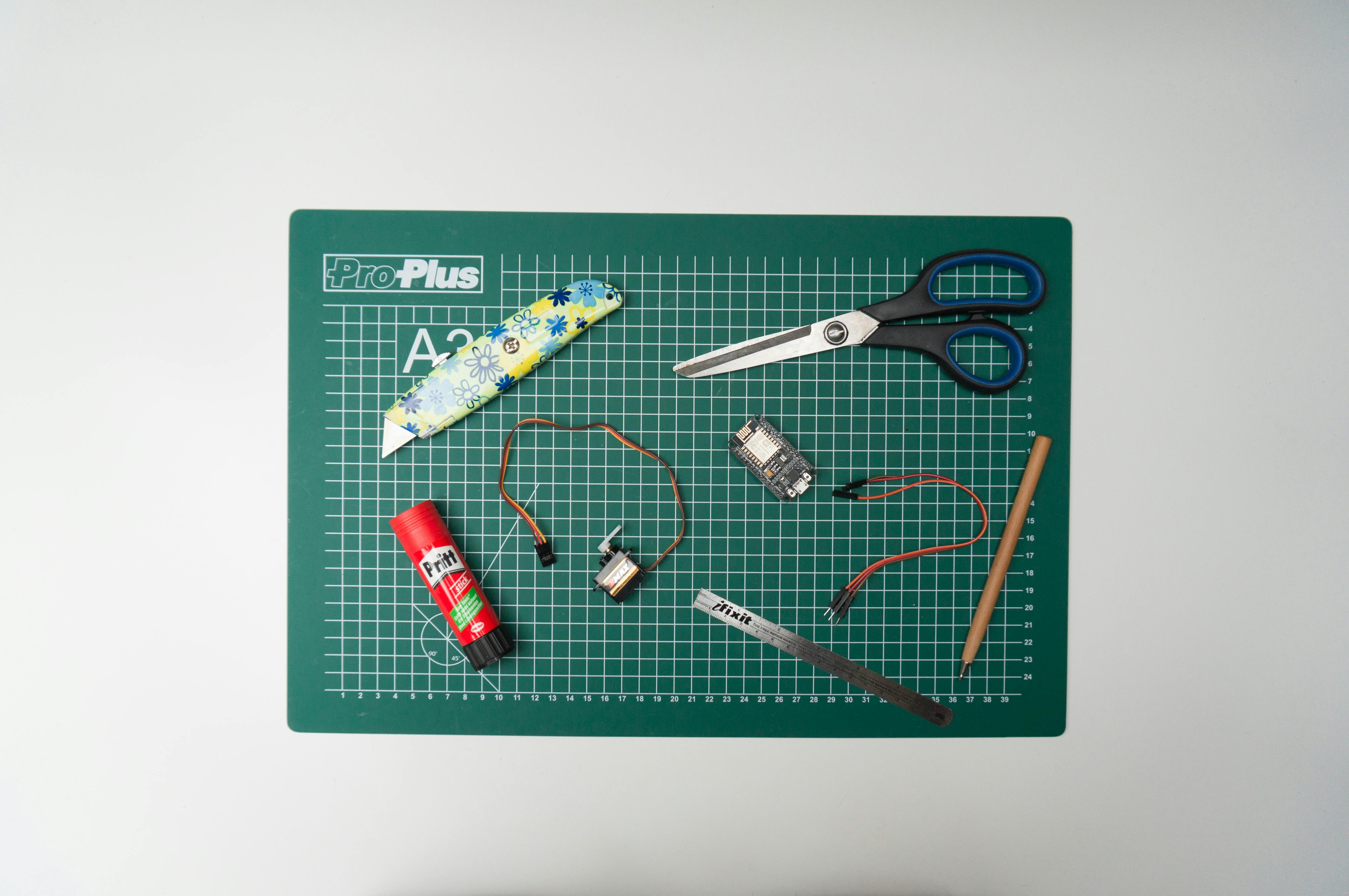 Uiteraard heb je een NodeMCU-ontwikkelbordje nodig. Zorg ervoor dat dit de smalle variant is die ook wordt aangeduid met 1.0 of V2. Je herkent ‘m aan de witte onderkant waar Amica op staat. Koop niet het NodeMCU-bordje dat verkocht wordt als V3. Dit bordje herken je aan een zwarte onderkant waar LoLin op staat. Het woord LoLin staat bij deze verkeerde versie tevens op de bovenkant. Naast de NodeMCU hebt je nog een aantal dingen nodig om een Paper Signal te maken. Qua hardware heb je een micro-servomotor nodig. Google kiest zelf voor de SG92R, maar een servomotortje van gelijke afmeting als de SG90 of de ES08MII uit het pakket ‘Arduino en nu verder (online)’ (zie kader) zal ook werken. Omdat je zowel de NodeMCU als het servomotortje inbouwt in een papieren behuizing is er geen plaats voor een breadboard. Daarom heb je speciale jumperdraden nodig met aan de ene kant een ingang (female) en aan de andere kant een pinnetje (male), oftewel een male/female-jumperdraad. Hierdoor kun je de stekker van het servomotortje direct aansluiten op de pinnetjes van de NodeMCU.