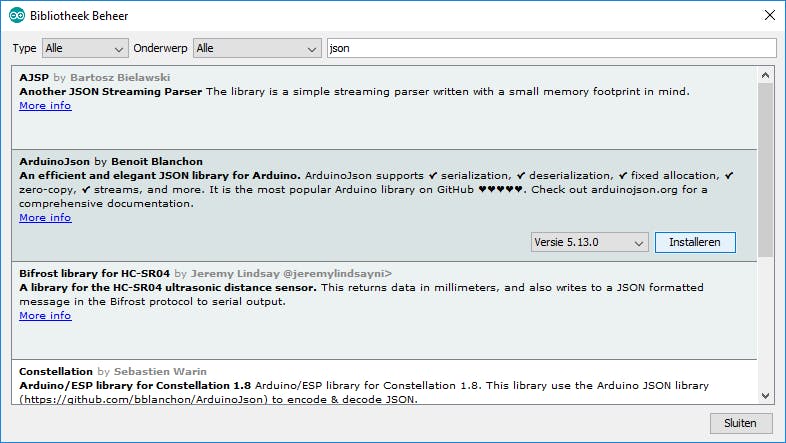 Voordat je aan de slag kunt met het bouwen van je Paper Signal, dien je eerst de Arduino IDE te installeren en de ondersteuning voor de NodeMCU toe te voegen in de Arduino IDE. Hoe dat moet, lees je hier. Googles code maakt gebruik van de ArduinoJson-bibliotheek. Die bibliotheek moeten we daarom toevoegen aan de ontwikkelomgeving, anders geeft de code foutmeldingen bij het compileren. Klik in het menu op Schets en vervolgens op Bibliotheek gebruiken. Klik op Bibliotheken beheren en tik json in het zoekveld. Selecteer ArduinoJson en klik op Installeren en vervolgens op Sluiten. Je kunt de code downloaden van Github . Pak deze code uit en open de code in de Arduino-ontwikkelomgeving.