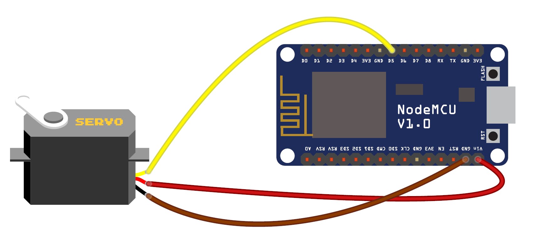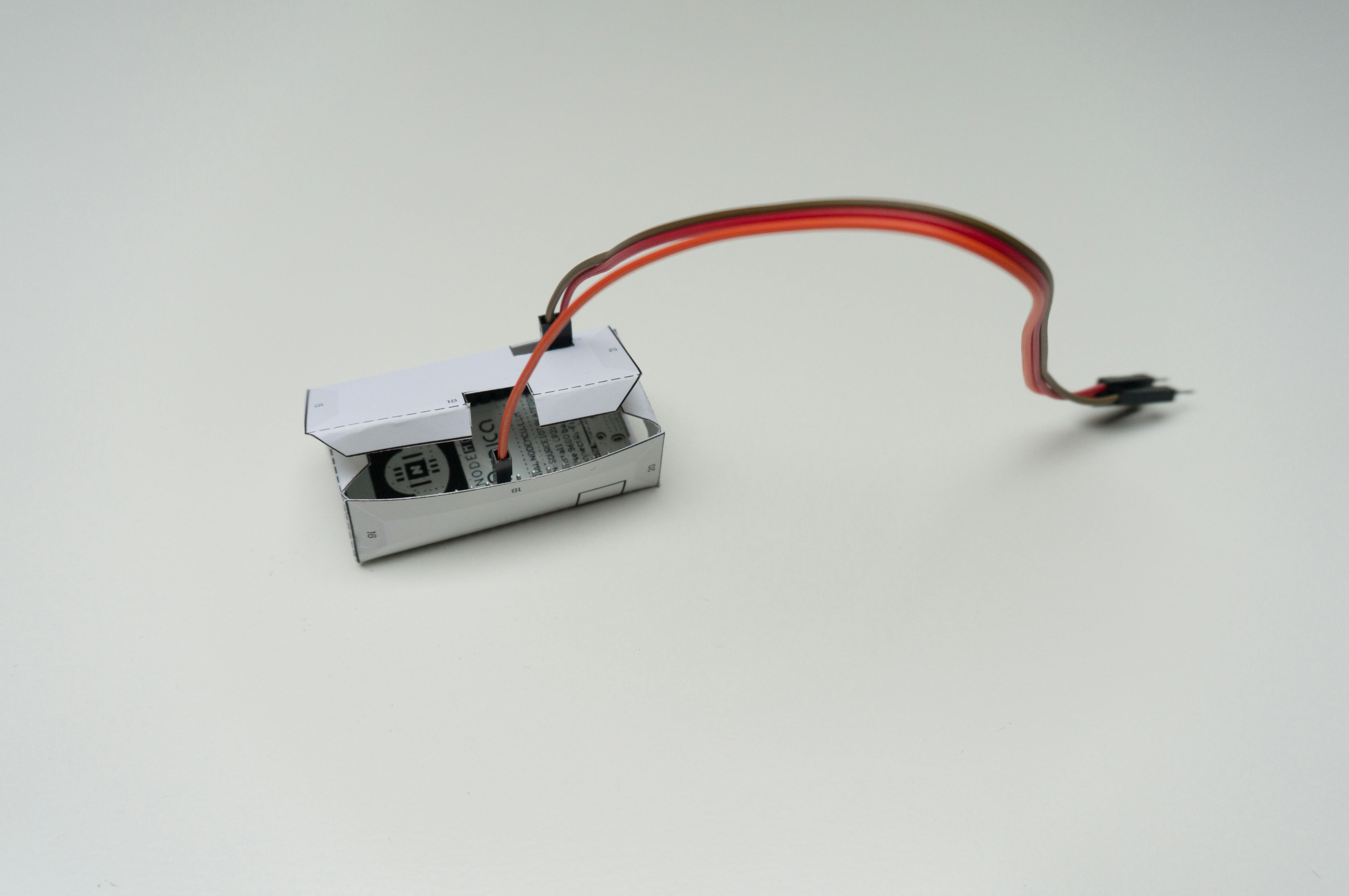 Vouw het doosje op de deksel na dicht en leg de NodeMCU onderste boven in het doosje. Sluit de oranje data-draad van je servomotor aan op pin D5 van de NodeMCU, de rode draad op VIN en de bruin of zwarte draad op GND. Haal de draden door de gaten in het dekseltje. Dat zal je met de voedingsdraden vermoedelijk wel lukken, maar de oranje datadraad is wellicht net te krap doordat de NodeMCU net wat breder is dan het door Google bedachte Huzzah-bordje. Is dat het geval, knip dan het gedeelte dat wij op de afbeelding geel gemaakt hebben weg. Hierdoor zitten de aansluitpin van het jumperdraad niet in de weg. Is het dichtplakken lastig, gebruik dan een stukje plakband om dit doosje dicht te plakken. Plak dat niet teveel op de bovenkant van het doosje, want daar moet je later nog een papieren deel opplakken en mogelijk hecht de papierlijm die je gebruikt niet goed op plakband. Vouw nu de rest van de onderdelen in elkaar volgens de instructies die Google je in deel 5 geeft.