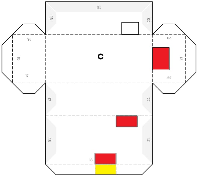 Bij stap 4 gaan we het net even anders doen dan Google, omdat wij gebruik maken van de NodeMCU in plaats van de Feather Huzzah. Knip de buitenkant van C uit. Vervolgens zitten er in onderdeel C vier vlakken die je moet uitsnijden. We gaan er echter maar drie uitsnijden omdat de NodeMCU geen batterijaansluiting heeft. De vlakken die je moet uitsnijden hebben we op de afbeelding rood gemaakt. Snijd het door ons toegevoegde gele vlak dat je ook op de afbeelding nog niet uit. Vervolgens moet je nog iets anders doen, want waar je onderdeel C net als de andere onderdelen normaal gesproken met de bedrukte kant naar binnen vouwt, vouwen wij dit onderdeel juist met de bedrukte kant naar buiten. De aansluitingen van de NodeMUC zitten namelijk op een andere plek dan die op de Huzzah. Het toeval wil echter dat de aansluitingen precies gespiegeld zijn. De bedrukking zul je uiteindelijk niet meer zien omdat onderdeel C in het Paper Signal verborgen zit en er een ander onderdeel op wordt geplakt.