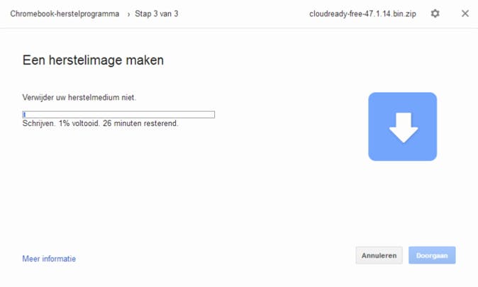 Je downloadt CloudReady hier. De download van het zip-bestand start automatisch. Ga in Windows naar het menu Start en open de Chromebook Recovery Utility. Klik rechtsboven op het tandwiel en kies voor Lokale image gebruiken om zelf een zip-bestand te selecteren. Blader naar de map waar je het zojuist gedownloade zip-bestand hebt opgeslagen. Kies bij Selecteer het medium dat u wilt gebruiken de usb-stick om het image op te plaatsen. Klik op Doorgaan gevolgd door Nu maken. Let op dat de voortgang verkeerde waardes kan aangeven: bij ons werd het zip-bestand 400 procent uitgepakt met nog -20 seconden resterend. Klik achteraf op Gereed om het venster te sluiten.