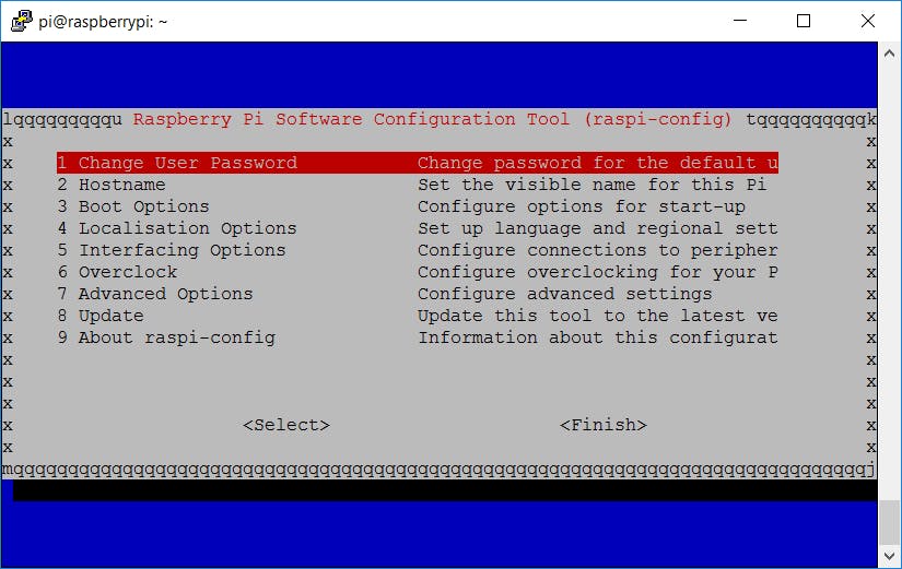 Zoek het ip-adres van je Pi op in de dhcp-leases van je router en log daarop in met het programma PuTTY. Voer als gebruikersnaam pi in en als wachtwoord raspberry. Update allereerst de pakketlijsten met de opdracht sudo apt update en upgrade daarna alle geïnstalleerde programma’s met sudo apt upgrade. Voer daarna het configuratieprogramma uit met sudo raspi-config. Wijzig je wachtwoord, zodat je Pi niet ongewild onderdeel gaat uitmaken van een botnet. En zet je tijdzone correct (in Localisation Options). Sluit het configuratieprogramma daarna af (Finish).