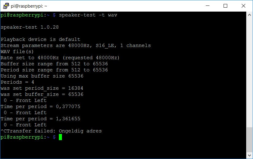 Nu de clouddiensten van Google die we in ons project gebruiken zijn geconfigureerd, is het tijd om aan de Pi te gaan knutselen. Ga terug naar het PuTTY-venster met de opdrachtprompt van je Pi of log opnieuw op je Pi in. Voer de opdracht speaker-test -t wav uit om een testgeluid af te spelen en druk op Ctrl+C om het afspelen te stoppen. Als je niets hoort, controleer dan of je luidspreker goed is aangesloten. Voer daarna de opdracht arecord --format=S16_LE --duration=5 --rate=16k --file-type=raw out.raw uit en spreek iets in de microfoon in. Controleer of het is opgenomen met aplay --format=S16_LE --rate=16k out.raw.