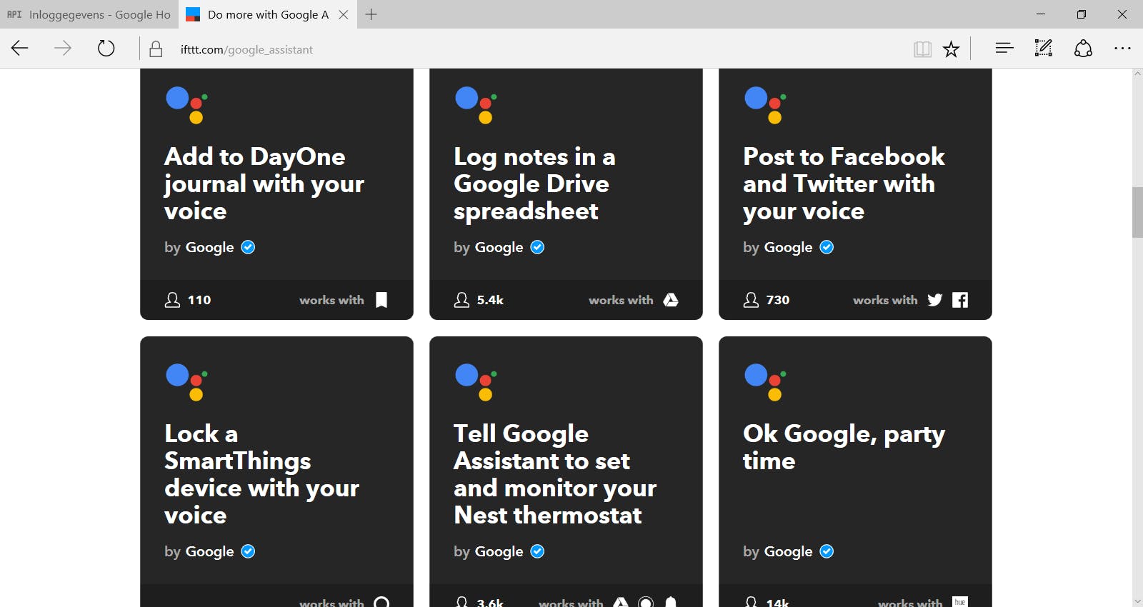 Bekijk eens de applets (vroeger ‘recepten’ genoemd) in het Google Assistant-kanaal van IFTTT en probeer er een paar uit. Zo is er een applet om het volgende uur in je Google Agenda te blokkeren, om je Nest-thermostaat in te stellen, om de kleur van je Philips Hue-verlichting te veranderen, om taken aan een lijst toe te voegen die je assistent op het einde van de dag naar je e-mailt en nog vele andere. Op deze manier verbind je je eigen Google-assistent met alle mogelijke internetdiensten en slimme apparatuur.