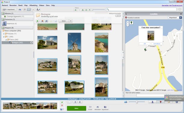 Geeft Picasa bij een foto niet de juiste locatie aan? Het kan zijn dat de gps-ontvanger even geen signaal had of dat dit niet betrouwbaar genoeg was om uw locatie goed vast te stellen. Geen nood, u mag de rode ballon met ingedrukte muisknop oppakken en ergens anders op de kaart weer loslaten. De tekstballon Foto hier neerzetten? verschijnt, waarna u de verplaatsing kunt bevestigen. Picasa slaat de gewijzigde locatie voor u op in de foto. Overigens is het aan u hoe nauwkeurig u locaties wilt vastleggen. Voor de meeste doeleinden hoeft het echt niet heel precies. Houd er ook rekening mee dat u alleen de plek ziet waar u zelf was toen u de foto maakte en dus niet de locatie van bijvoorbeeld een bergketen die op de foto in de verte te zien is.