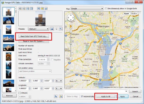 Zoner Photo Studio 14 Free is een voorbeeld van een programma waarmee locatiegegevens aan foto's zijn toe te voegen via het logbestand van een gps-tracker (of app op een smartphone). Er bestaan meerdere smaken van dit programma, alleen de variant 'Free' is gratis. Kies een map, selecteer een aantal foto's, klik met rechts en kies Assign GPS Data. Vervolgens wijst u met de knop Read Data from GPS Track Log een logbestand met locatiegegevens aan (meerdere mag ook). Zoner gaat aan de slag en daarna ziet u op een plattegrond waar welke foto gemaakt is. Met Apply to All schrijft u de gegevens naar alle foto's weg. Bent u terug in het hoofdscherm van het programma, klik dan met rechts op een miniatuur en kies Show GPS Data om op een plattegrond te zien waar deze foto gemaakt is. Of dubbelklik op het aardbolletje aan de bovenzijde van de miniatuur.