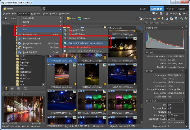 Mocht een aantal foto's nog steeds geen locatiegegevens hebben, dan kunt u in Zoner Photo Studio 14 Free met de hand de juiste plek aanwijzen via menuoptie Information / GPS / Assign GPS Data from Google Earth. Installeer dan wel eerst het programma Google Earth op uw pc. Locatiegegevens uit foto's wissen kan Zoner ook en wel via Information / GPS / Remove GPS Data. Ook ditmaal kunt u dit beter met een kopie doen en niet met de originele bestanden.