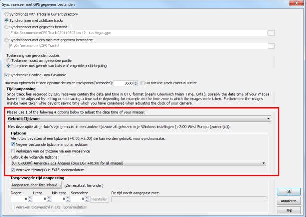 Als de tijdzone waar u gefotografeerd hebt anders is dan op uw pc ingesteld, dan moet u dit aan Geosetter vertellen.