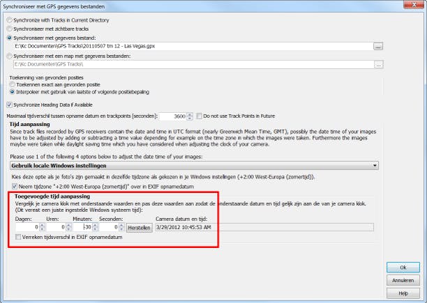 Is het klokje van uw camera verkeerd ingesteld, dan worden er verkeerde locaties door Geosetter gevonden. Dit is eenvoudig op te lossen door onder in het venster uit de vorige stap bij Toegevoegde tijd aanpassing de tijd op te geven die u op het camerascherm ziet. Het verschil met de pc-klok wordt als correctie gebruikt, zodat alsnog de juiste locaties gevonden worden. Let op dat het om de tijdafwijking gaat waarmee de foto's gemaakt zijn. Corrigeer een verkeerde cameraklok daarom pas nadat u foto's met Geosetter van locaties hebt voorzien. Want anders is er immers geen afwijking meer te zien op het camerascherm.