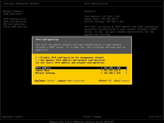 Het belangrijkste om nu te doen is de server een vast IP-adres te geven. Zoals je op de voorpagina kunt zien, is het huidige IP-adres uitgegeven via DHCP en dat kan dus zo maar veranderen. Bepaal welk IP-adres de server het beste kan krijgen en neem anders het IP-adres over dat deze nu heeft. Druk op F2 om de configuratieopties te starten. Druk op Enter om te bevestigen dat je als root inlogt en typ daarna het wachtwoord, bevestig met Enter. Ga met de pijltjestoets op het toetsenbord omlaag naar Configure Management Network / IPv4 Configuration. Ga naar Set status IPv4 adress and network configuration. Druk op de spatiebalk om deze configuratieoptie te kiezen. Druk weer op het pijltje omlaag en pas bij IPv4 Address het IP-adres aan en eventueel ook Subnet Mask en Default Gateway, al moet je die laatste twee alleen aanpassen als je de ESXi-server ook echt naar een heel ander netwerk verplaatst. Druk op Enter om de aanpassingen te bevestigen. Druk daarna op Esc om de managementconsole te verlaten en bevestig met Y dat je de configuratiewijziging wilt doorvoeren.
