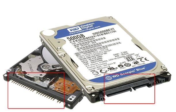Een notebook heeft meestal plek voor één harde schijf. De schijf is eenvoudig te verwijderen via de onderkant of zijkant van uw laptop. Meestal hebt u hier een schroevendraaier voor nodig. De fysieke omvang van de harde schijf is bijna altijd 2,5-inch (2,5"). Voordat u een nieuwe schijf kunt kopen, moet u weten welk type schijfaansluiting uw laptop heeft. Technisch gezien onderscheiden we er twee: SATA (Serial ATA) of IDE (PATA, parallel ATA). Oude laptops hebben een IDE-harde schijf, bij de wat nieuwere modellen hebt u een SATA-aansluiting. SATA en IDE zijn eenvoudig uit elkaar te houden. Een IDE-schijf heeft een brede aansluiting met veel pinnetjes die uit de schijf steken. Bij SATA wordt de schijf met twee compacte stekkers aan de notebook verbonden.