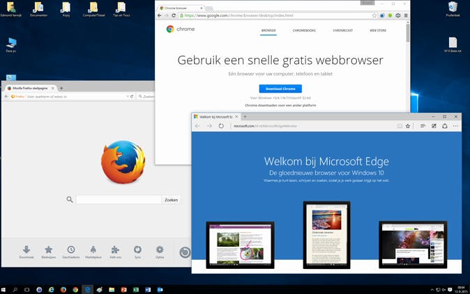 Edge is de nieuwe browser waarmee Microsoft, Firefox en Chrome beconcurreert. Hoe succesvol het daarmee zal zijn, is afwachten want Edge kent nog wel wat beperkingen. Zo ondersteunt Edge bijvoorbeeld nog geen plug-ins en is het ook niet even handig dat je vastzit aan Bing als zoekmachine. Gelukkig is Windows 10 erg tolerant als het gaat om alternatieve browsers én hebben alle browsers inmiddels wel geleerd vooral niet de hele pc over te nemen maar gewoon een goede webbrowser te zijn. Niets hindert je daarom om naast Edge ook Firefox en Chrome te installeren en een van beide ook tot je standaardbrowser te maken.
