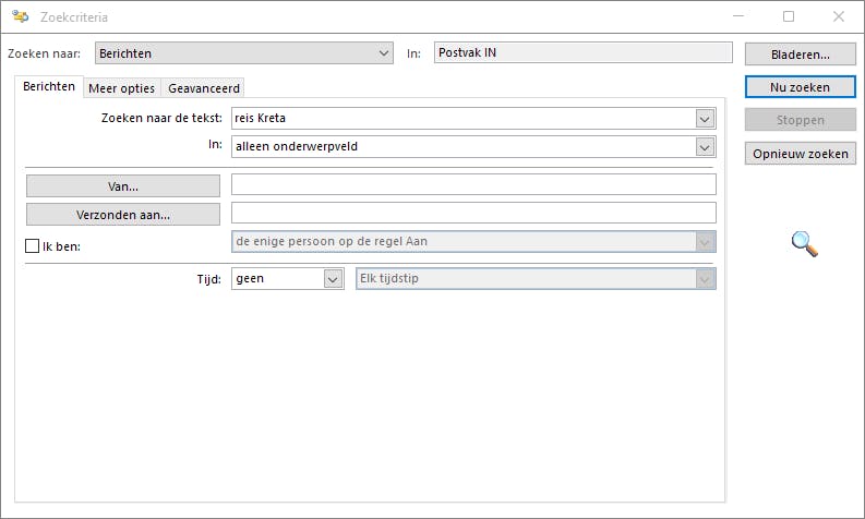 In het onderdeel Opties kun je Recente zoekopdrachten hergebruiken. En daarnaast staat de optie Hulpmiddelen voor zoeken, waar je heel gerichte zoekcriteria kunt ingeven, zoals een bepaald woord in het onderwerpveld of een bepaald stukje tekst in een mail.