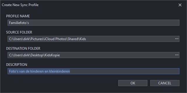 Het eerste wat je moet doen, is een nieuw synchronisatieprofiel maken. Op die manier maak je bijvoorbeeld een profiel om de map met foto’s te back-uppen en een ander profiel om documenten te beschermen. Telkens specifieer je de bronmap en de doelmap. Daarna geef je het profiel een herkenbare naam en een korte beschrijving.
