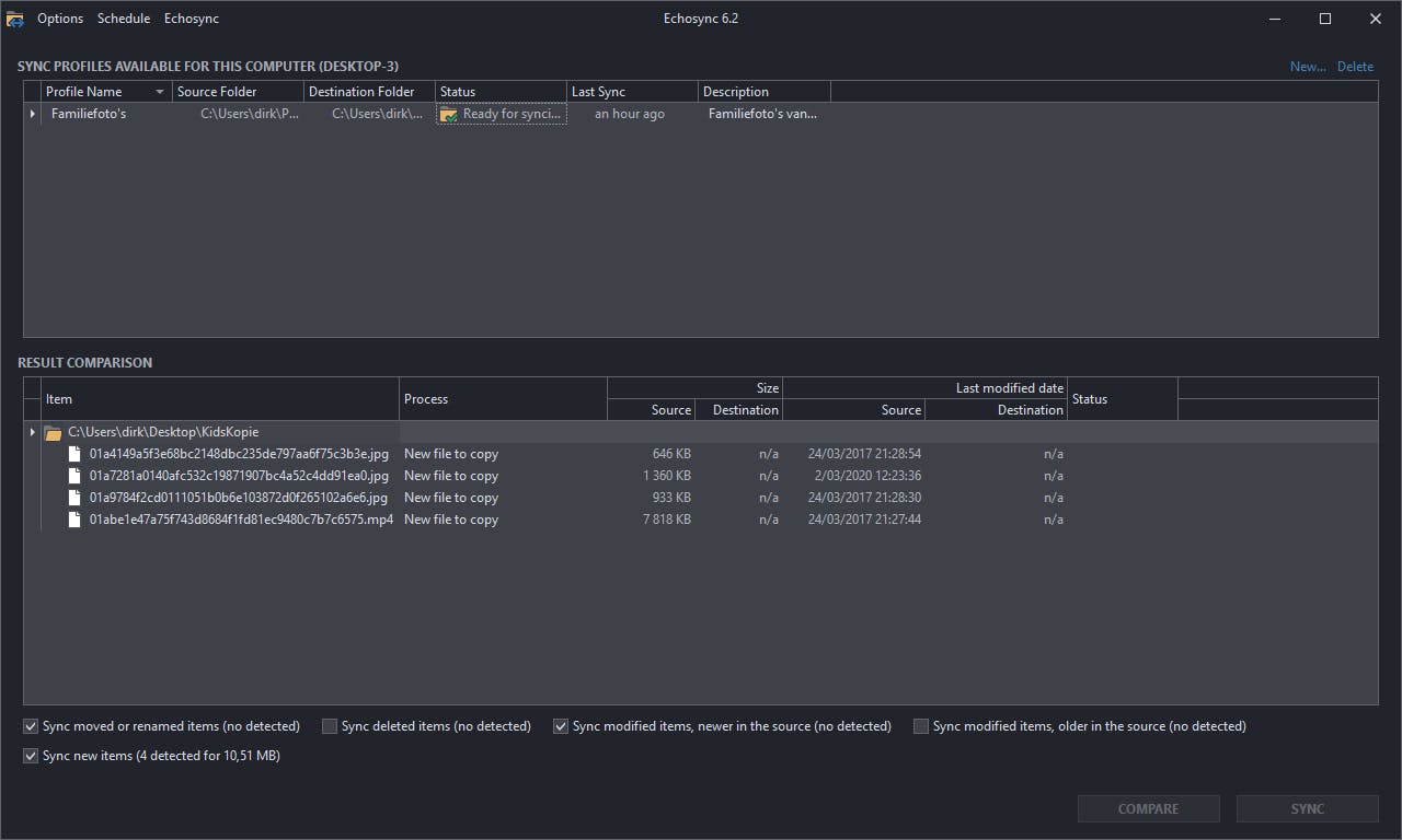 Vervolgens beschik je over twee belangrijke knoppen: Compare en Sync. Met de eerste vergelijkt Echosync de twee mappen die bij het profiel horen om de wijzigingen te detecteren. In het venster Result Comparison lees je de scanresultaten.