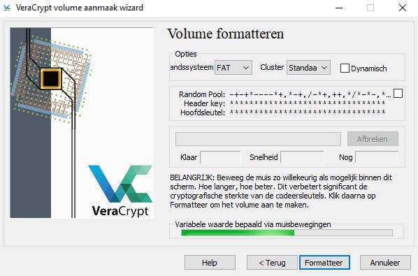 Beweeg nu binnen het venster van VeraCrypt met je cursor om de sterkte van de versleuteling te bepalen. Hoe langer je de cursor heen en weer verplaatst, hoe voller het balkje onderin beeld loopt. Je kunt dit zo lang doen als je zelf wil, we raden aan om door te gaan tot het balkje groen kleurt en vol is gelopen. Daarna druk je op Formateer en wordt het containerbestand aangemaakt. Hoe groter het bestand, hoe langer dit duurt. Sluit af met OK en Sluiten.