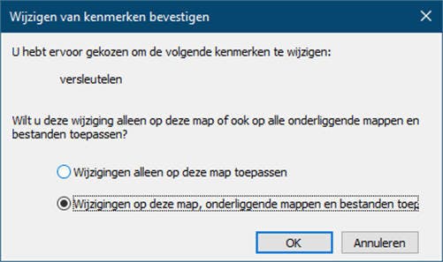 Het eigenlijke versleutelen van een map (of desnoods enkel bestand) is erg eenvoudig. Klik in de Verkenner met de rechter muisknop op het te versleutelen item. Klik in het geopende contextmenu op Eigenschappen en daarna onder het tabblad Algemeen op de knop Geavanceerd. Schakel de optie Inhoud versleutelen om gegevens te beveiligen in en klik op OK. Als je gevraagd wordt of je ook de onderliggende mappen wilt versleutelen kies je voor ja.