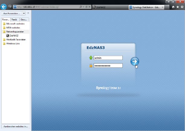 In de browser is nog steeds de webinterface van de NAS geopend. Het is handig om, nu u meer met de NAS gaat doen, de koppeling naar de NAS te bewaren als favoriet of bladwijzer. Het is maar een kleine handeling, maar erg gemakkelijk, al was het maar omdat u nooit meer dat lastige adres hoeft te typen of het moet onthouden. In Internet Explorer werkt dit als volgt. Open het onderdeel Favorieten en klik op de pijl rechts naast Aan favorieten toevoegen. Kies dan Indelen / Nieuwe map en geef de map de naam Netwerkapparaten. Bevestig met Enter en een klik op Sluiten. Sleep nu met de muis het adres van de NAS uit de adresbalk naar de map Netwerkapparaten in het venster met de favorieten. Open dan deze map en klik met rechts op de nieuwe snelkoppeling. Kies Naam wijzigen en typ dan de naam van de NAS of verkort het simpelweg tot NAS. Bevestig met Enter. De volgende keer dat u op de NAS wilt inloggen, is het voldoende om dat via de favoriet of bladwijzer te doen.