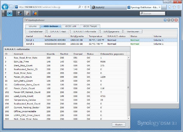 Een ander belangrijk punt voordat u meer functies op de NAS gaat activeren of deze anders gaat gebruiken, is de status van de harde schijven. De opslagruimte van de schijven is essentieel voor het functioneren van de NAS en ook of u die kunt inzetten voor belangrijke taken. Harde schijven zijn weliswaar het favoriete opslagmedium van deze tijd, ze zijn niet onfeilbaar. Ze kunnen crashen, leesfouten geven en opgeslagen data verminken. Elke harde schijf heeft bovendien een 'beperkte' levensduur doordat de bewegende delen slijten. Dat slijten duurt jaren, dus zo 'beperkt' is die levensduur nu ook weer niet. Toch kan het elk moment misgaan. Het is daarom belangrijk de SMART-status van de schijven te controleren. Op een QNAP kan dat via Schijf Beheer / HDD Smart / Samenvatting / Harde schijf gezond waar u van alle schijven de SMART-status ziet. Ook geeft de NAS hier een duidelijke samenvatting en kunt u bij SMART Informatie de echte SMART-meldingen zien. Via Test kunt u bovendien de schijven een test laten doorlopen. Synology biedt deze informatie via Opslagbeheer / HDD-beheer waar de Status staat vermeld. Ook hier kunt u de exacte SMART-informatie opvragen en een SMART-test uitvoeren. Is een van de schijven niet 'normaal' of geeft deze zelfs een 'error', dan wordt het aanbevolen die schijf te vervangen. Op harde schijven zit vaak een jarenlange garantie, omruilen is meestal geen probleem.