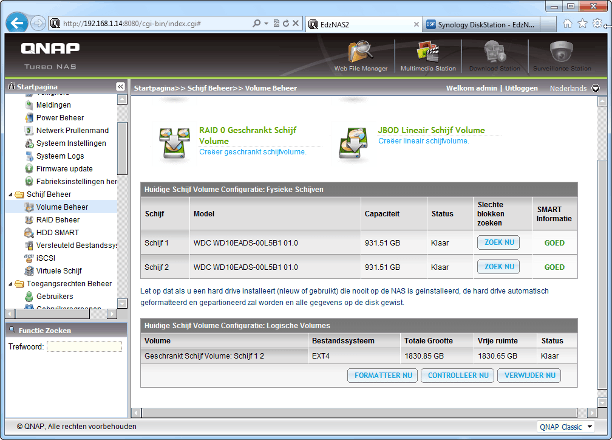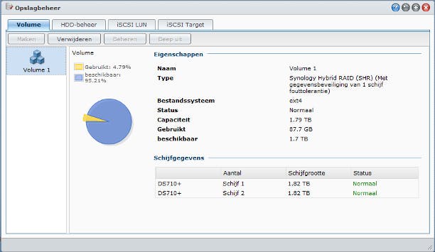 Een moeilijke keuze is de volume-indeling. Bij een NAS met één schijf is dit natuurlijk geen probleem, bij meer dan één schijf is het lastiger. Met twee schijven is er de mogelijkheid voor RAID0 of RAID1. Met RAID0 hebt u meer opslag- en leessnelheid, terwijl u met RAID1 de helft aan opslagruimte opoffert om alle gegevens dubbel te bewaren. Zo raakt u geen gegevens kwijt bij verlies van een van de harde schijven. Hebt u een NAS met drie of meer schijven, dan is RAID5 mogelijk. Dit wordt over het algemeen gezien als de beste combinatie van zekerheid voor de gegevens, snelheid en zo min mogelijk ruimteverlies. Uitleg over RAID en hoe u een NAS het beste kunt indelen vindt u op onze site in het artikel Ruimteverlies met RAID. Synology biedt bovendien nog een slimme tussenvorm waarbij de NAS zelf de beste indeling bepaalt. Deze Synology Hybrid RAID is vanaf firmwareversie 3.0 beschikbaar. Uitleg hierover vindt u in het artikel Synology Hybrid Raid. U kunt via Opslagbeheer / Volume zien welke volume-indeling op uw NAS is aangemaakt. Bij QNAP is dat te vinden onder Schijf Beheer / Volume Beheer.