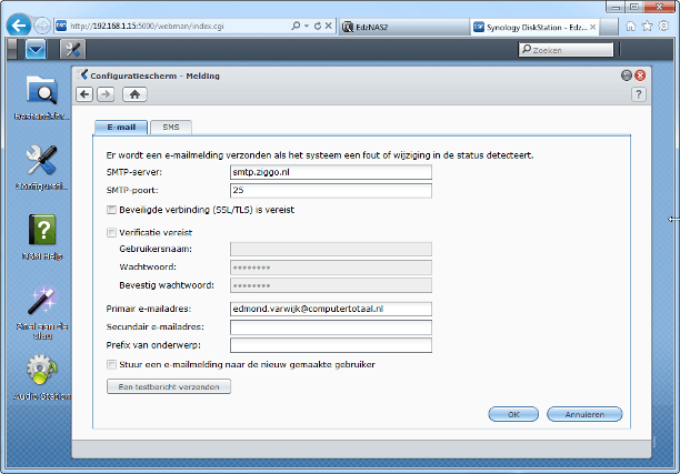 Eerder in dit artikel hebben we al in de logboeken gekeken. Logboeken zijn het dagboek van de NAS en de meldingen vertellen u veel over het gebruik en de status van het apparaat. In plaats van af en toe te kijken hoe het met de status is, is het beter om direct geïnformeerd te worden. De meeste NAS-apparaten kunnen foutmeldingen die in het logboek terechtkomen ook per e-mail versturen aan de beheerder van de NAS. Op een QNAP vindt u deze mogelijkheden onder Systeem Beheer / Meldingen. Op de Synology heet dit onderdeel Melding en u vindt het in het Configuratiescherm. Bij de SMTP-server vult u de naam in van de e-mailserver waar de berichten vandaan verstuurd worden. Dat is meestal dezelfde server waar u ook de gewone mail vanaf verstuurt. Kijk daarvoor in de configuratiegegevens van uw internetprovider, of gewoon in de configuratie van het mailprogramma op uw pc. Vul bij het primair e-mailadres (Synology) het e-mailadres in waarop u de meldingen wilt ontvangen. Op de QNAP is het net even anders. Nadat u de SMTP-server hebt ingesteld, klikt u op Toepassen. Open dan het tabblad Waarschuwingen en kies het niveau van de waarschuwingen dat u wilt ontvangen en zet dan bij instellingen voor E-mail notificatie / E-mail adres 1 het e-mailadres waarop u de melding wilt ontvangen. Eventueel kunt u bij zowel QNAP als Synology ook nog een tweede e-mailadres opgeven. Ook kunt u bij beide de instellingen controleren door een testbericht te versturen. Bevestig via Toepassen. Voortaan krijgt u de echt belangrijke meldingen van uw NAS netjes in de mailbox die u hebt opgegeven.