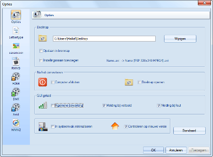 Als het goed is, staat de taal standaard ingesteld op Nederlands. Is dat niet geval, dan gaat u naar Taal / Select more languages. Vervolgens selecteert u Dutch, waarna u bevestigt met OK. Verder is het handig om aan te geven in welke map u de geconverteerde bestanden wilt bewaren. Klik bovenaan op Opties. Via de knop Wijzigen bij het onderdeel Doelmap selecteert u de gewenste locatie. Bevestig met OK. Desgewenst kunt u ook de overige instellingen naar eigen wens aanpassen. Zo kunt u het programma minimaliseren naar het systeemvak of de computer na een converteertaak automatisch laten uitschakelen. Sluit het dialoogvenster middels Toepassen en bevestig alles met een klik op OK.