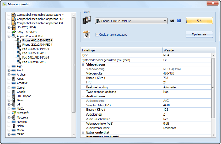 Hebt u geen idee welke uitvoerinstellingen u voor uw mobiele telefoon of mp3-speler moet kiezen? FormatFactory weet van een aantal apparaten precies welke bestandsformaten compatibel zijn. Daarnaast regelt het zelfstandig de waarden voor onder meer de resolutie, beeldverhouding en het aantal frames per seconde. Klik op Video / Converteren naar Mobiel apparaat. Aan de linkerkant ziet u een waslijst met merken, waaronder bekende namen als Philips, Creative, Apple, Sony, LG, Nokia, Motorola en Samsung. Klik op het plusteken om te zien of uw telefoon of mp3-speler ook in de lijst staat. Klik op uw keuze en bekijk de bijbehorende uitvoerinstellingen aan de rechterkant. Desgewenst kunt u nog wat zaken handmatig aanpassen. Klik op OK en selecteer in het volgende scherm via Bestand Toevoegen het betreffende filmpje dat u wilt omzetten. Kies nu Openen en OK, waarna u het converteerproces kunt starten.