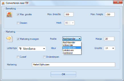 Naast video en audio converteert FormatFactory ook afbeeldingsformaten. De uitvoerformaten waaruit u kunt kiezen, zijn onder andere jpg, png, bmp, gif en tif. Maak aan de linkerkant onder Afbeelding uw keuze. Selecteer met behulp van Bestand toevoegen een plaatje en klik vervolgens op Uitvoerinstellingen. Het is mogelijk om de afbeelding te schalen door een vinkje voor Max. grootte te zetten en het aantal pixels voor de breedte en hoogte in te vullen. Verder kunt u de afbeelding draaien. Soms is het handig om een watermerk aan het logo toe te voegen, bijvoorbeeld voor publicatie op internet. Plaats een vinkje in het selectiehokje voor Markering invoegen en kies de gewenste positie. Selecteer verder een lettertype, kleur en puntgrootte. Ook zijn er mogelijkheden om de tekst te onderstrepen of cursief te maken. Typ een tekst in het veld achter Markering en sluit het dialoogvenster met OK. Klik ten slotte nogmaals op OK en kies dan Starten.