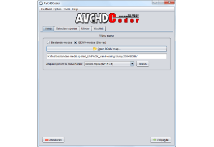 AVCHDCoder moet eerst de HD-film analyseren, voordat u hem kunt verkleinen. De software accepteert zowel mkv-bestanden als bdmv-mappen met een complete mappenstructuur. Overigens is er geen ondersteuning voor HD-films die in een imageformaat zijn verpakt. Voor het omzetten van mkv-bestanden selecteert u de optie Bestands-modus. Indien er een rip van een blu-ray op uw harde schijf staat, kiest u voor BDMV-modus (Blu-ray). Klik vervolgens op Open film bestand of Open BDMV map en blader naar de juiste locatie. Selecteer de map of het bestand en kies voor Openen, waarna de film wordt toegevoegd. Klik daarna op Volgende.