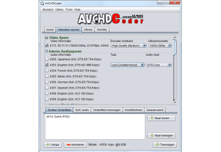 Om een dvd samen te stellen, gaat u naar het tabblad Uitvoer en selecteert u aan de linkerkant een dvd van 4,7 GB of 8,5 GB. Een film bestaat uit verschillende onderdelen, zoals ondertitels en geluidssporen. Omdat een HD-film soms wel 50 GB groot is, zult u bepaalde zaken moeten weglaten, anders past hij nooit op een (dubbellaagse) dvd. Op het tabblad Selecteer sporen zet u daarom alleen vinkjes voor alle elementen die u verwacht te gebruiken. Uiteraard laat u het vinkje staan voor het videospoor, want anders is er geen beeld. Het is mogelijk om desgewenst een lagere resolutie te kiezen. Ook met de geluidssporen kunt u even spelen. Wat hebt u immers aan Duits-, Frans of Spaanstalig nagesynchroniseerde audiosporen als u films altijd in het Engels bekijkt? U kunt verder schijfruimte winnen door aan de geluidskwaliteit te sleutelen bij het onderdeel Audio doel. Een dts-spoor vereist bijvoorbeeld meer ruimte dan ac3. Vergeet overigens niet om Nederlandstalige ondertiteling te selecteren. De keuzes die u maakt zijn van invloed op de kwaliteit. Hoe meer elementen u toevoegt, hoe sterker AVCHDCoder de film moet comprimeren. Tijdens het uitproberen van de verschillende opties ziet u onderaan dat de bitrate steeds verandert. De kunst is om deze waarde zo hoog mogelijk te houden. Ga ervan uit dat u minimaal 4500 kbps nodig hebt om een redelijke kwaliteit te bereiken. Als u klaar bent met de instellingen, klikt u op Toevoegen en ten slotte op Yes.