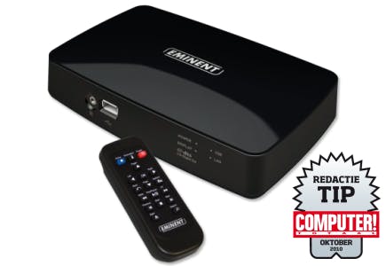 Net als voorloper EM7075 is ook deze vernieuwde editie met toegevoegde DTS-decodeeropties uitgerust met de degelijke 8655-chipset van Sigma Designs. Hiermee speelt u moeiteloos alle veelvoorkomende audio- en videoformaten af, zoals de mkv-container in combinatie met de videocodec h.264 of x.264. Ook met rips van blu-ray- en dvd-schijfjes kan de hardware uitstekend overweg. Er is helaas geen menu-ondersteuning, zodat u het afspeelbestand handmatig moet opzoeken. De EM7075-DTS bevat geen mogelijkheid om een interne harde schijf te plaatsen. Wel bevindt er zich aan de voorzijde een usb-aansluiting, waaraan u gemakkelijk een extern opslagapparaat koppelt met een capaciteit van maximaal 1,5 TB. Daarnaast plaatst u de speler met behulp van een ethernetaansluiting of optionele wifi-adapter in een netwerk, zodat het ook mediabestanden van een computer of NAS oppikt. Het menu ziet er fraai uit en spreekt eigenlijk voor zich, al zochten we wel tevergeefs naar een knop om terug te bladeren. Gelukkig is deze mogelijkheid terug te vinden op de piepkleine afstandsbediening. Eminent heeft DTS-downmixing toegevoegd, wat handig is als u een film wilt afspelen met uitsluitend een DTS-geluidsspoor, op een televisie zonder aangesloten surroundset. Fanatieke downloaders gebruiken de Bittorrent-cliënt Transmission of usenetprogramma NZBGet om zonder tussenkomt van de computer mediabestanden binnen te halen. Deze worden vervolgens automatisch uitgepakt naar een afspeelbaar mediaformaat. In de Nederlandstalige handleiding vindt u een uitgebreide beschrijving over hoe dat werkt. Verder is er in het menu een optie aanwezig om rechtstreeks filmpjes te bekijken via YouTube. De behuizing is van zwart kunststof en heeft een wat goedkope uitstraling. Wie echter de geringe onvolkomenheden voor lief neemt, haalt u voor een zacht prijsje een uitstekende mediaspeler is huis.