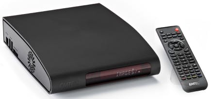 Dit veelzijdige media-apparaat van Emtec heeft een nogal fors formaat vergeleken met de concurrentie. De bovenkant loopt ovaal af, hierdoor is het lastig is om er iets op te zetten. Aan de voorkant bevindt zich een display. U ziet daarop de titels van films en audiotracks voorbijkomen. Aan de zijkant treft u twee usb-host-poorten en een usb-slave-aansluiting. Verder is er een kaartlezer aanwezig. U hebt hiermee voldoende mogelijkheden om de meegeleverde interne harde schijf van 1 TB te vullen. Het menu bestaat uit grote pictogrammen, waaraan is te zien dat deze Movie Cube is uitgerust met een chipset van Realtek. De meerwaarde van dit model is de ingebouwde DVB-T-tuner, waarmee u direct televisieprogramma’s kunt opnemen. In Nederland zijn alleen de drie publieke netten en een regionale zender via de tv-tuner bereikbaar. U kunt echter ook vanaf uw televisie, videorecorder of dvd-speler opnemen. Met behulp van de optie Time Shift pauzeert u uitzendingen om ze op een later moment weer te hervatten. Het apparaat heeft een NAS-functie. Alle bekende audio- en videoformaten worden ondersteund, waarbij ook menu’s van dvd’s worden weergegeven. De V800H heeft aanvullende webfuncties aan boord, zoals internetradio en een Bittorrent-cliënt. Er wordt gebruikgemaakt van actieve koeling, wat duidelijk hoorbaar is. Er zijn tevens uitvoeringen met een interne harde schijf van 500 GB (219 euro), 1,5 TB (269 euro) en 2 TB (319 euro) verkrijgbaar.