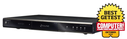 De Dune Base 3.0 beschikt over specifieke eigenschappen, die de speler ondanks de hoge prijs evengoed interessant maken. Met een standaardlengte van 43 centimeter past de behuizing prima in een audiokastje tussen uw overige hifi-apparatuur. Qua uiterlijk heeft hij veel weg van een blu-ray- of dvd-speler. Het lijkt net of er in het midden een cd/dvd-lade aanwezig is, maar niets is minder waar. Het betreft namelijk een slot waarin u een 3,5inch-schijf kunt stoppen. Vooraan bevinden zich enkele bedieningsknoppen en een display. Aan de achterzijde vindt u legio aansluitingen, waaronder eSATA en analoge 7.1audio-outputs. Daarnaast kunt u met behulp van drie usb-poorten een beroep doen op externe media. Het ontbreken van een usb-slave-poort is een nadeel, zodat u de speler niet direct op uw computer kunt aansluiten om data naar de interne harddisk over te pompen. U koppelt indien gewenst wel een externe optische drive aan een usb-poort, zodat u ook fysieke cd’s en dvd’s afspeelt. Het menu navigeert lekker en het openen van gedeelde mappen of het benaderen van een UPnP-server is een fluitje van een cent. Dankzij de krachtige chipset van Sigma Designs, speelt u met gemak blu-ray-rips af via het netwerk of een harde schijf. Deze mediaspeler gaf als enige in het testveld probleemloos menu’s van blu-ray-rips en AVCHD-images weer. Ook de interactieve toevoeging BD-Live wordt ondersteund. Verder zet u deze veelzijdige speler eventueel in als NAS-server, zodat u via het netwerk data veilig bewaart. Ook de mogelijkheden om media te downloaden via Bittorrent en om te luisteren naar internetradio ontbreken niet. Mocht u over een ruim budget beschikken, dan haalt u met de Dune Base 3.0 zonder twijfel een van de beste mediaspelers van dit moment in huis.