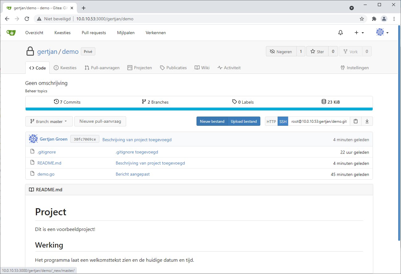 Als je je projectpagina op Gitea bezoekt, zie je dat de beschrijving direct getoond wordt.