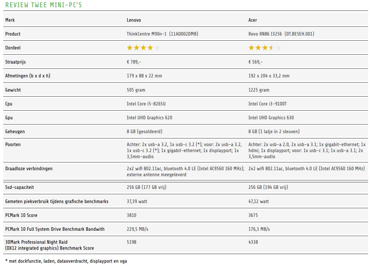 Zowel de Acer Revo Box als de Lenovo ThinkCentre M90n-1 zijn stille, kleine mini-pc’s die geschikt zijn voor productiviteitsapplicaties, het creëren van digitale content en mediastreaming. De Lenovo-pc is nog iets compacter dan de Acer-box, presteert ongeveer 15 procent sneller en heeft snellere usb-poorten. Wel is het werkgeheugen vast gesoldeerd en dus achteraf niet uit te breiden. Voor al dat moois vraagt Lenovo een behoorlijk stevige prijs. De Acer Revo Box levert voor minder geld veel kwaliteit en heeft een vrije ram-sleuf waarmee je het werkgeheugen zelf uitbreidt. Zelfs als je het krachtigere Core i5-model kiest betaal je alsnog minder dan voor de ThinkCentre.