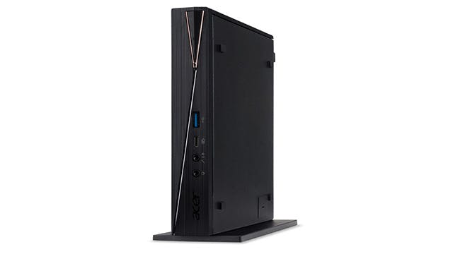 De platte zwarte behuizing is gemaakt van metaal en kunststof, met een goudkleurig accent rond de V-vormige stroomknop. Acer levert geen toetsenbord of muis mee; daar zorg je zelf voor.