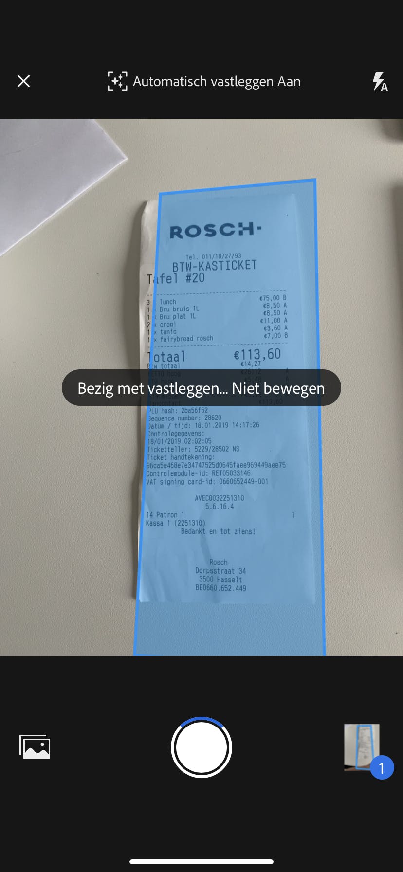 Adobe Scan gebruikt de camera van je smartphone als draagbare scanner. Om een factuur, parkeerticket, restaurantbonnetje of betaalbewijs van de taxi in pdf-formaat op te slaan, moet je het dus simpelweg fotograferen. Dat is erg eenvoudig. Houd je smartphone recht boven het document. Probeer je toestel goed stil te houden. Op de sluiterknop tikken is zelfs niet nodig. Adobe Scan herkent het document automatisch en slaat razendsnel een afbeelding op. Zo kun je meerdere documenten snel achter elkaar vastleggen. Alleen je document wordt opgeslagen: de inhoud in het blauwe vak.
