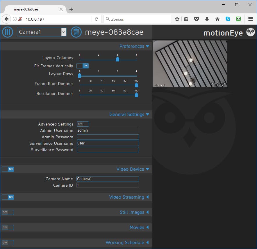 De configuratie kun je volledig afhandelen via de gebruikersinterface. Het is verstandig eerst een wachtwoord voor zowel Admin Username (admin) als Surveillance Username (user) in te stellen onder General Settings. Hier kun je ook de optie Advanced Settings aanzetten om alle features van motionEyeOS te zien. Standaard zijn veel opties namelijk verborgen.