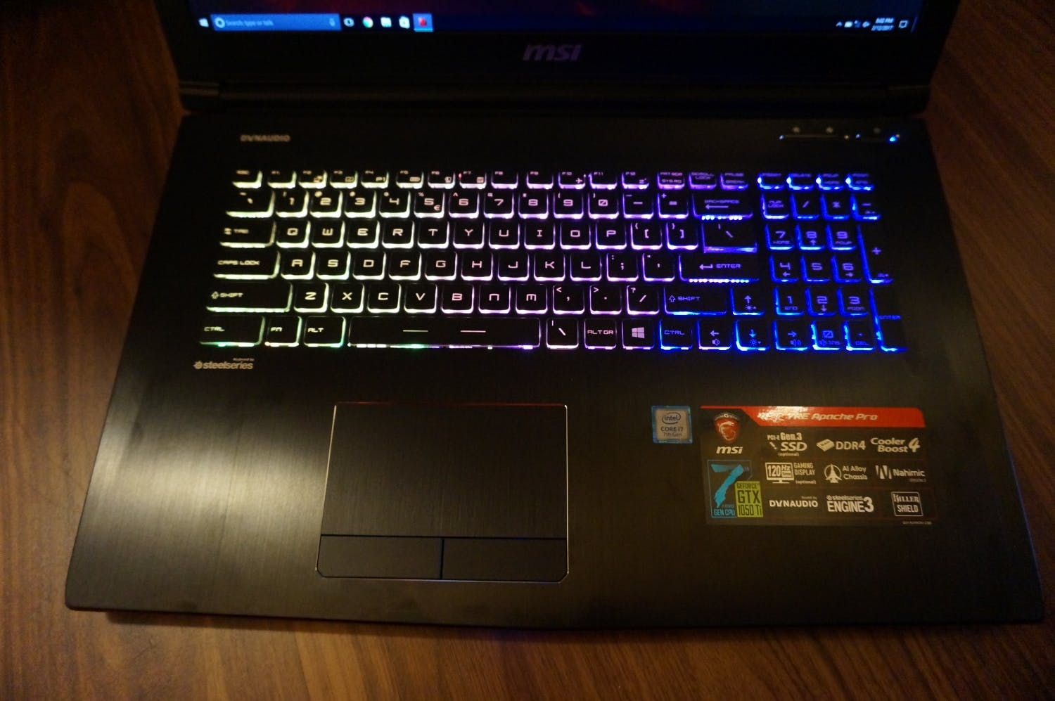 In de aluminium bovenplaat is netjes een chiclet-toetsenbord uit de stal van gamingmerk SteelSeries verwerkt. Het is geen mechanisch toetsenbord, maar met een travel van 1,9 mm en een voelbare klik is het wel een heel prettig toetsenbord voor zowel tikken als gamen. Zoals we van een laptop uit deze prijsklasse verwachten is het toetsenbord voorzien van verlichting. Dat is in dit geval rgb-verlichting waardoor je iedere denkbare kleur kunt instellen. Het toetsenbord is daarbij verdeeld in drie zones waarvan de kleur afzonderlijk kan worden ingesteld. Dat kun je uiteraard handmatig instellen, maar kleuren kunnen via de software ook automatisch worden ingesteld. Zo kan een kleur bijvoorbeeld gekoppeld aan bijvoorbeeld de status van je wapens en gezondheid en een spel. Over de touchpad zijn we minder enthousiast. Het is vervelend dat de touchpad de structuur van het aluminium probeert na te bootsen. Dit patroon is namelijk erg goed voelbaar wanneer je vinger over de touchpad glijdt. Natuurlijk gebruik je voor gamen wel een losse muis.